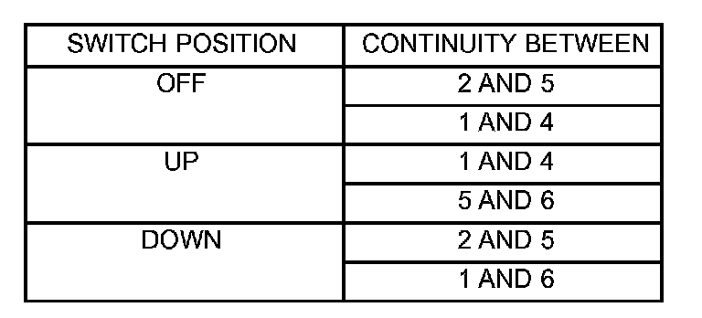For switch testing, remove the switch. (Refer to ELECTRICAL/POWER WINDOWS/POWER WINDOW SWITCH - REMOVAL ). Using an ohmmeter, refer to Window Switch Continuity Charts to determine if continuity is correct and. If the results are not obtained, replace the switch.