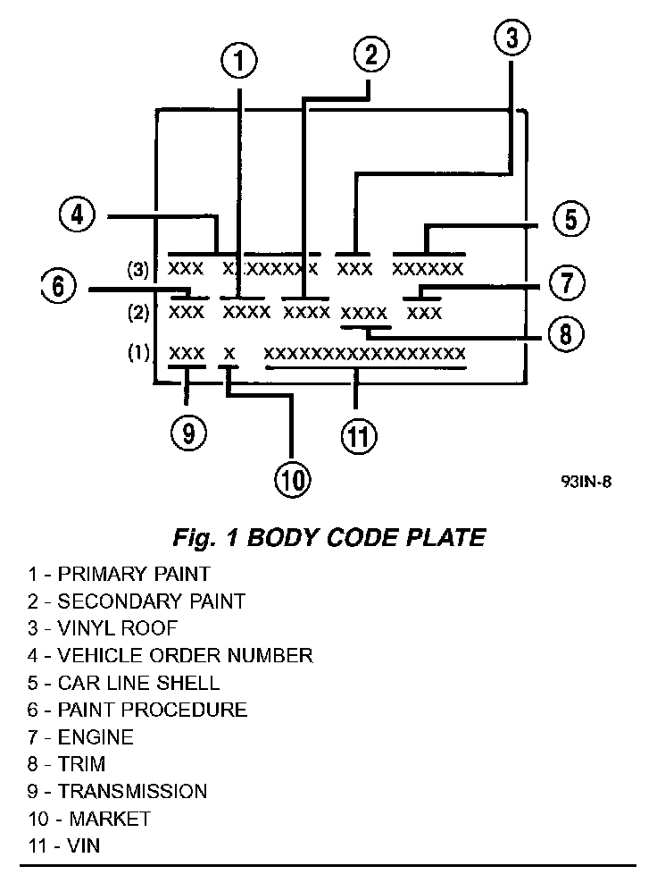 The Body Code Plate (Fig. 1) is located in the engine compartment on the driver side strut tower. There are seven lines of information on the body code plate. Lines 4, 5, 6, and 7 are not used to define service information. Information reads from left to right, starting with line 3 in the center of the plate to line 1 at the bottom of the plate.