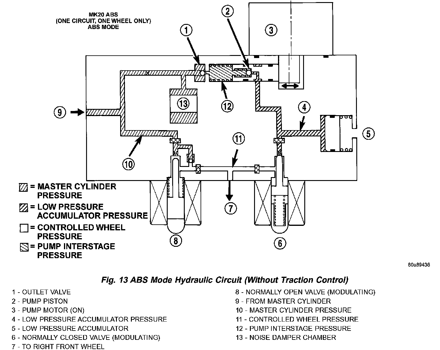 The hydraulic fluid control valves control the flow of pressurized brake fluid to the wheel brakes during the different modes of ABS braking. The following paragraphs explain how this works. For purposes of explanation only, it is assumed that only the right front wheel is experiencing antilock braking; the following diagrams show only the right front wheel in an antilock braking operation.