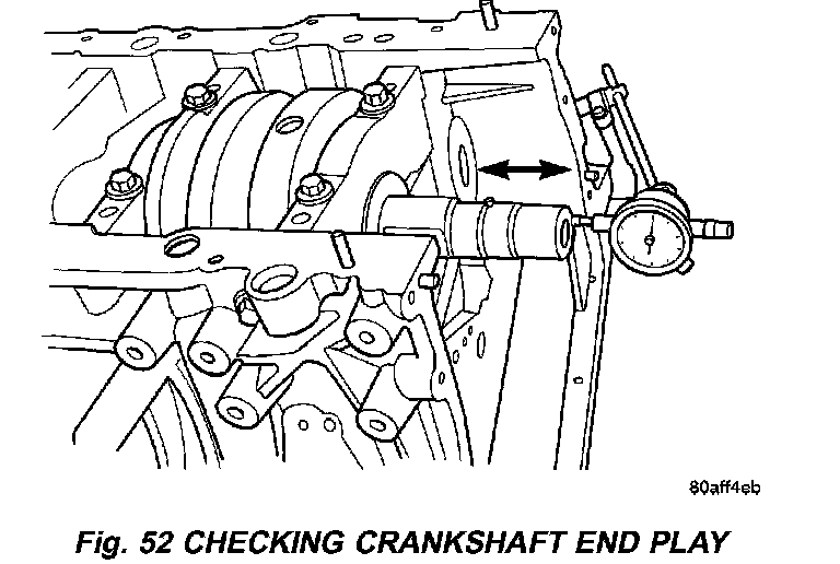 CRANKSHAFT END PLAY1. Mount a dial indicator to a stationary point at front of engine. Locate the probe perpendicular against nose of crankshaft (Fig. 52).