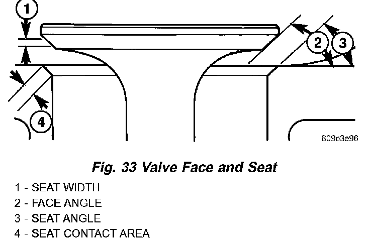 4. When seat is properly positioned the width of the intake 1.00 to 1.50 mm (0.0394 to 0.0591 inch) and exhaust seats should be 1.25 to 1.75 mm (0.049 to 0.069 inch) (Fig. 33).
