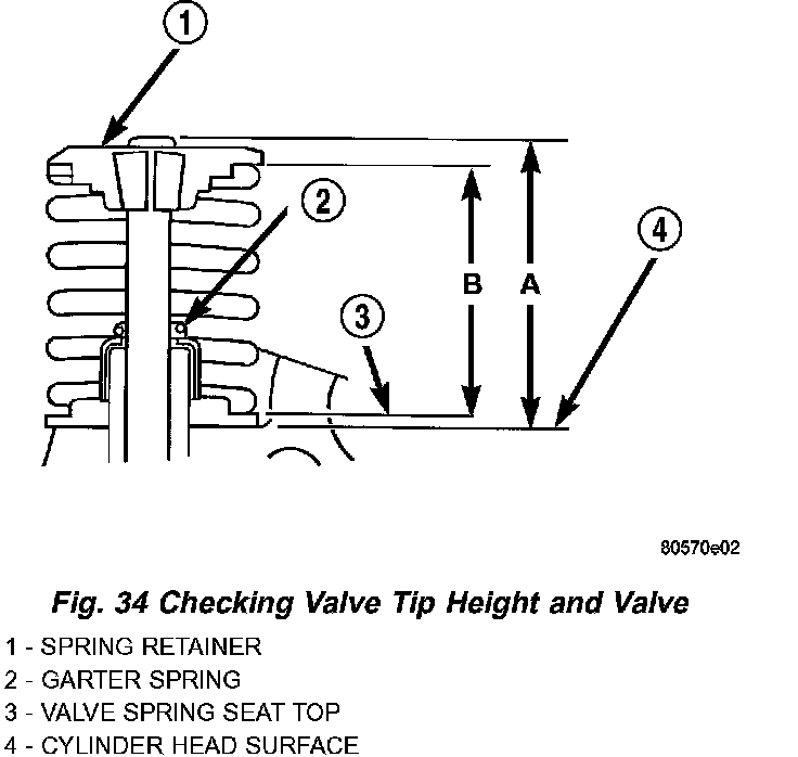 2. If valves or seats have been refaced, check valve tip height (a) (Fig. 34). If valve tip height for intake valve is greater than 47.59 (1.8737 inch) or 49.14 (1.9347 inch) for exhaust valve, grind valve tip until within specifications. Make sure measurement is taken from cylinder head surface to the top of valve stem.