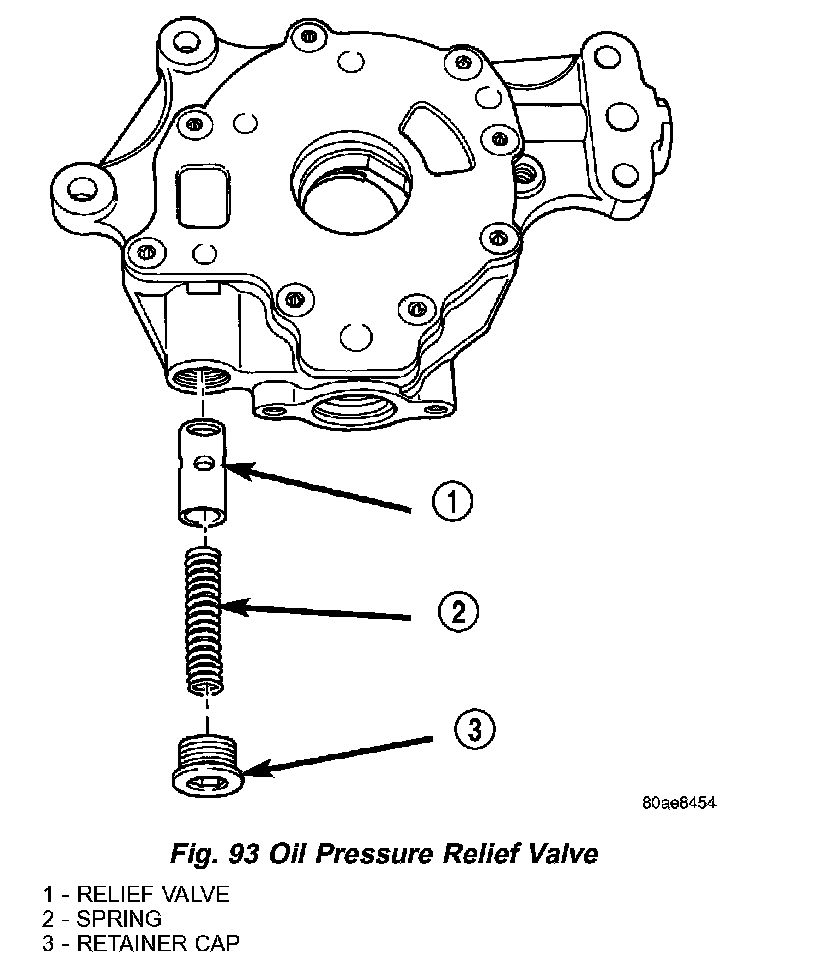 CAUTION: Oil pump pressure relief valve must be installed as shown in (Fig. 93) or engine damage may occur.