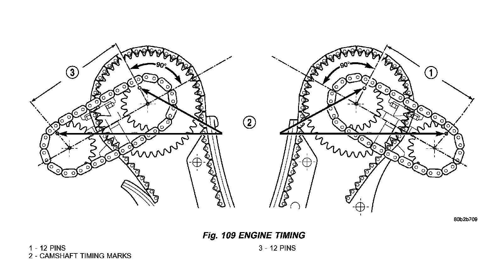 4. Count chain pins from the mark on the intake camshaft towards the exhaust camshaft. Engine is timed correctly when there are 12 chain pins between the timing marks on the intake camshaft and exhaust camshaft (Fig. 109).