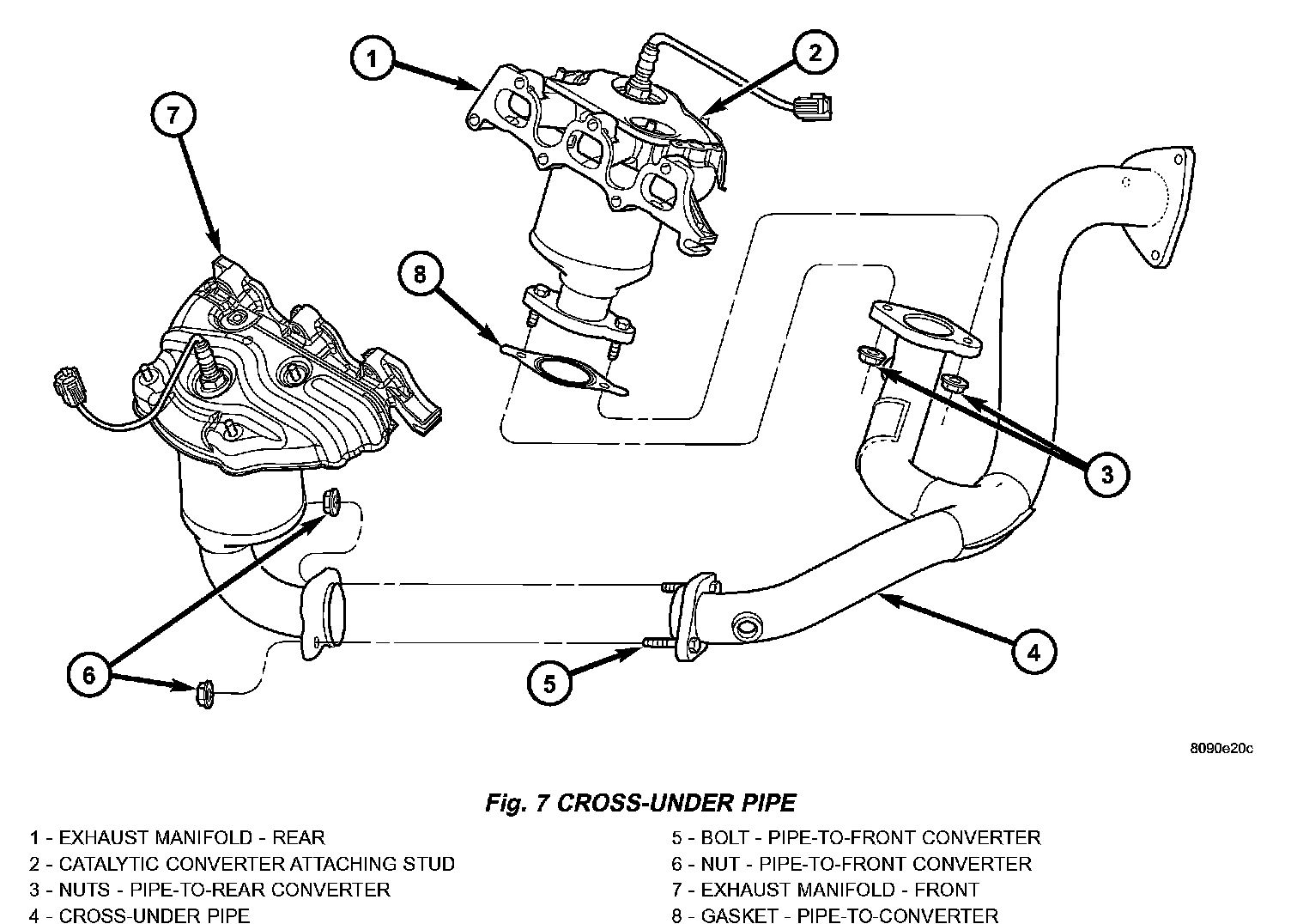 5. Remove fasteners attaching cross-under pipe to catalytic converters.