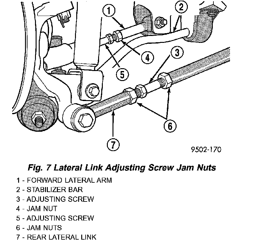 4. While holding adjustment screws from turning, use a crow foot and torque wrench, and tighten all lateral link adjusting screw jam nuts to a torque of 92 Nm (68 ft. lbs.). This will securely hold the adjusting screws from turning.