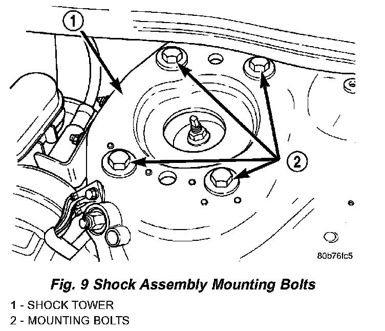 3. Loosen the shock assembly mounting bolts on the side marked in step 1. Loosen the bolts enough to allow adequate space for removal of the plastic locating pins that align the upper mounting bracket with the shock tower.