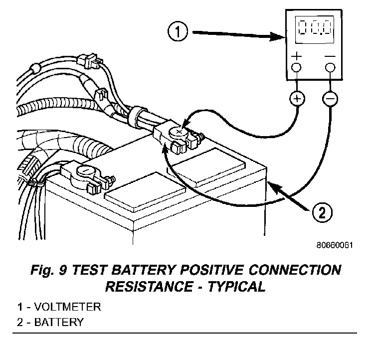 2. Connect the positive lead of the voltmeter to the battery positive terminal post. Connect the negative lead of the voltmeter to the battery positive cable terminal clamp (Fig. 9). Rotate and hold the ignition switch in the Start position. Observe the voltmeter. If voltage is detected, correct the poor connection between the battery positive cable terminal clamp and the battery positive terminal post.