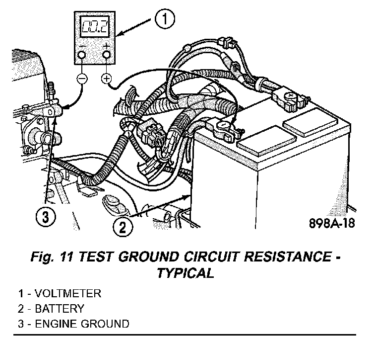 4. Connect the voltmeter to measure between the battery negative cable terminal clamp and a good clean ground on the engine block (Fig. 11). Rotate and hold the ignition switch in the Start position. Observe the voltmeter. If the reading is above 0.2 volt, clean and tighten the battery negative cable eyelet terminal connection to the engine block. Repeat the test. If the reading is still above 0.2 volt, replace the faulty battery negative cable.