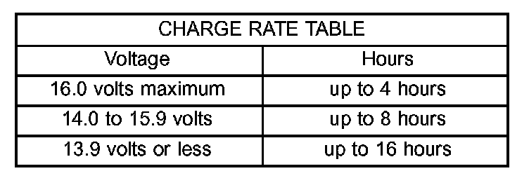 3. Battery chargers vary in the amount of voltage and current they provide. The amount of time required for a battery to accept measurable charging current at various voltages is shown in the Charge Rate Table. If the charging current is still not measurable at the end of the charging time, the battery is faulty and must be replaced. If the charging current is measurable during the charging time, the battery may be good and the charging should be completed in the normal manner.