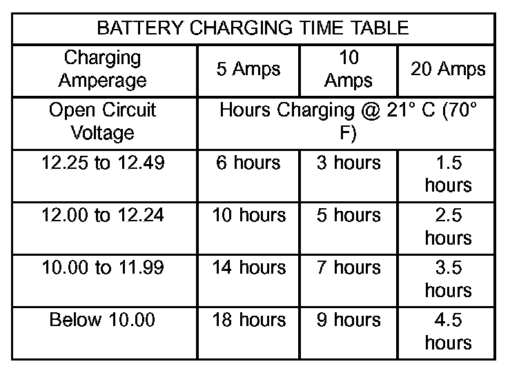 The Battery Charging Time Table gives an indication of the time required to charge a typical battery at room temperature based upon the battery state-of-charge and the charger capacity.
