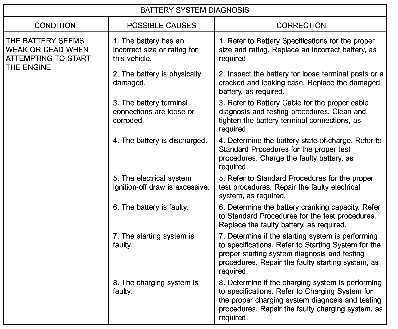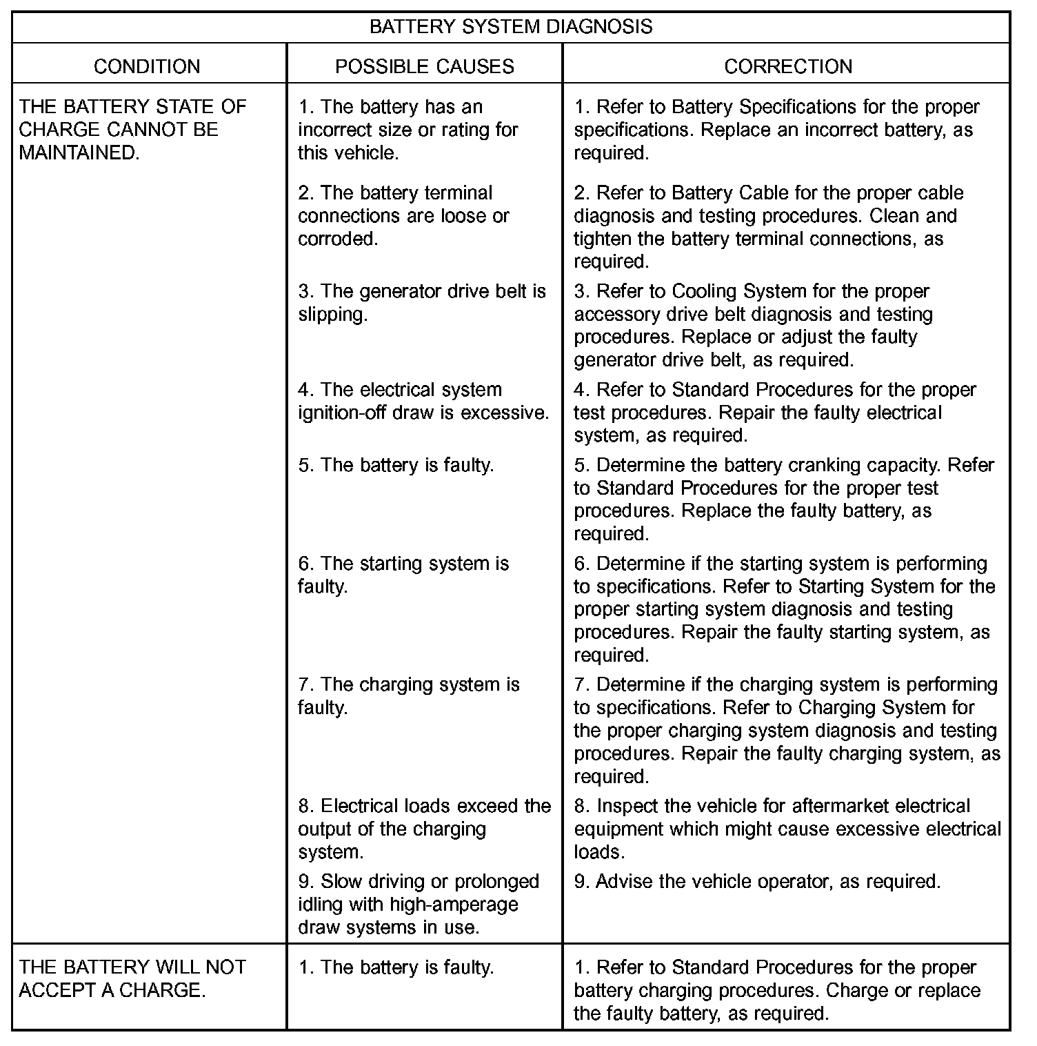 The battery starting, and charging systems in the vehicle operate with one another and must be tested as a single complete system. In order for the engine to start and the battery to charge properly all of the components that are used in these systems must perform within specifications. It is important that the battery, starting, and charging systems be thoroughly tested and inspected any time a battery needs to be charged or replaced. The cause of abnormal battery discharge, overcharging or early battery failure must be diagnosed and corrected before a battery is replaced and before a vehicle is returned to service. The service information for these systems has been separated to make it easier to locate the specific information you are seeking. However, when attempting to diagnose any of these systems, it is important that you keep their interdependency in mind.
