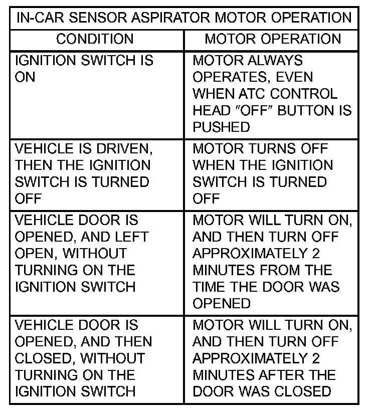 Air drawn from the passenger compartment by the in-car sensor aspirator motor assembly, and flows over the thermistor. The in-car sensor thermistor changes resistance with air temperature. The BCM measures this resistance and calculates the temperature of the air drawn into the ATC Control. The ATC system then makes adjustments to maintain the optimum passenger compartment comfort. Refer to the ATC In-Car Sensor Aspirator Motor Operation table for when the ATC Sensor is operating.