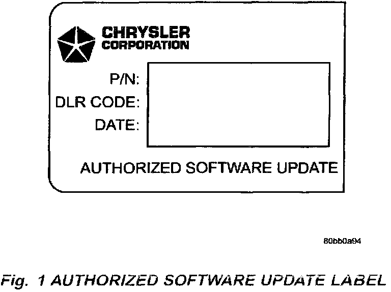 3. Type the necessary information on the "Authorized Software Update Label" p/n 04669020 (Fig. 1). Attach the label to the PCM and/or TCM as necessary and cover the label(s) with the clear plastic overlay.