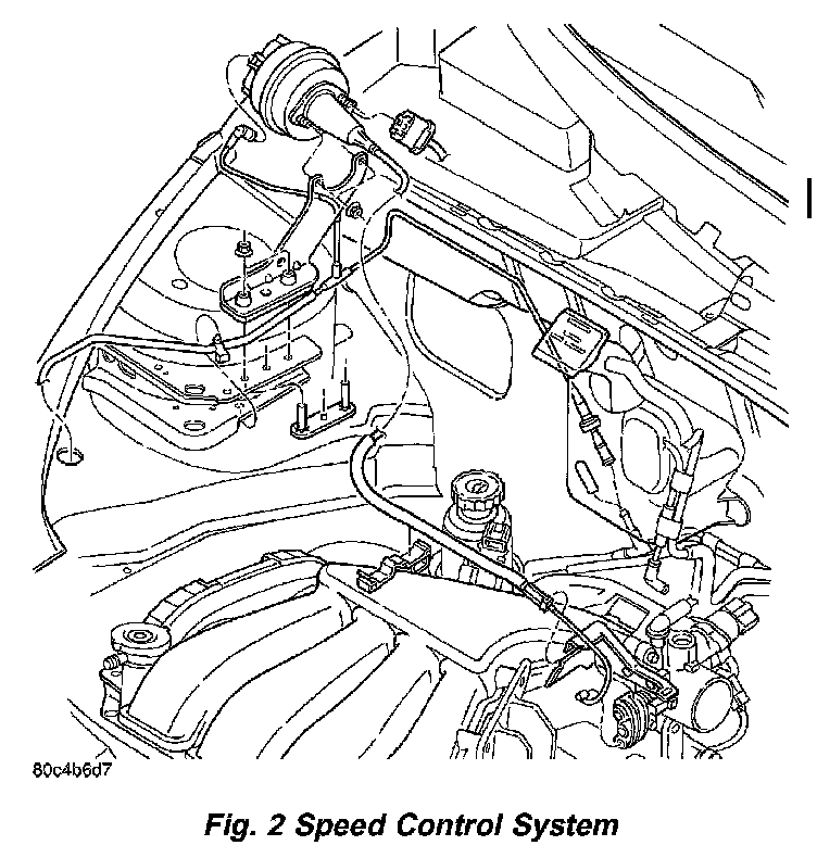 The speed control system is electronically controlled and vacuum operated The electronic control is integrated into the Powertrain Control Module, located on the left side of the engine compartment next to the air cleaner The controls are located on the steering wheel and consist of a single switch The ON, OFF, RESUME, ACCEL, SET, COAST, and CANCEL, lever is located on the right of the steering wheel For identification and location of the major components.