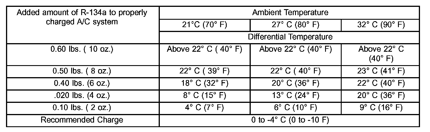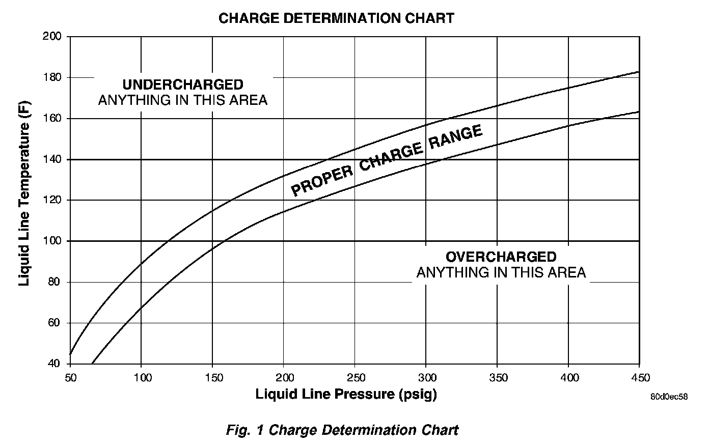 5. Observe liquid line pressure and liquid line temperature. Using the Charge Determination Chart determine where the system is currently operating. If the system is operating in the overcharge region, reclaim all the refrigerant and recharge per A/C label. If the system is operating in the undercharged region, proceed to the partial charge procedure.