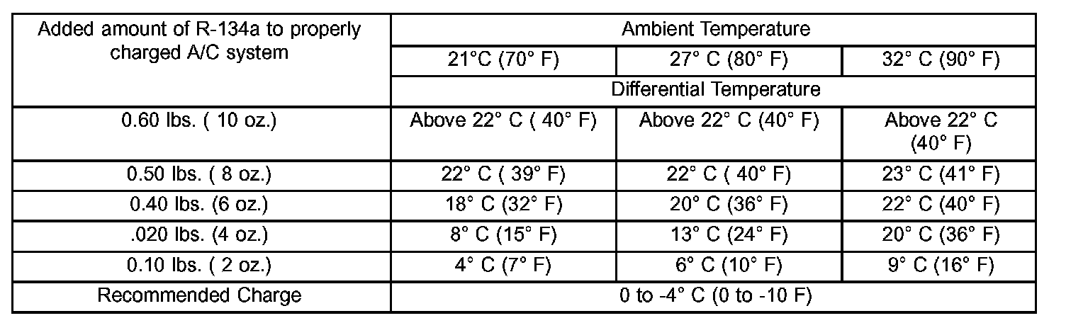 11. EXAMPLE The ambient temperature is 21 °C (70 °F) The evaporator inlet tube temperature is 12 °C (54 °F) and the evaporator outlet tube temperature is 10 °C (50 °F) Subtract the inlet tube temperature from the outlet tube temperature The difference is -2 °C (-4 °F) With a -2 °C (-4 °F) temperature differential at 21 °C (70 °F) ambient temperature, the system is fully charged