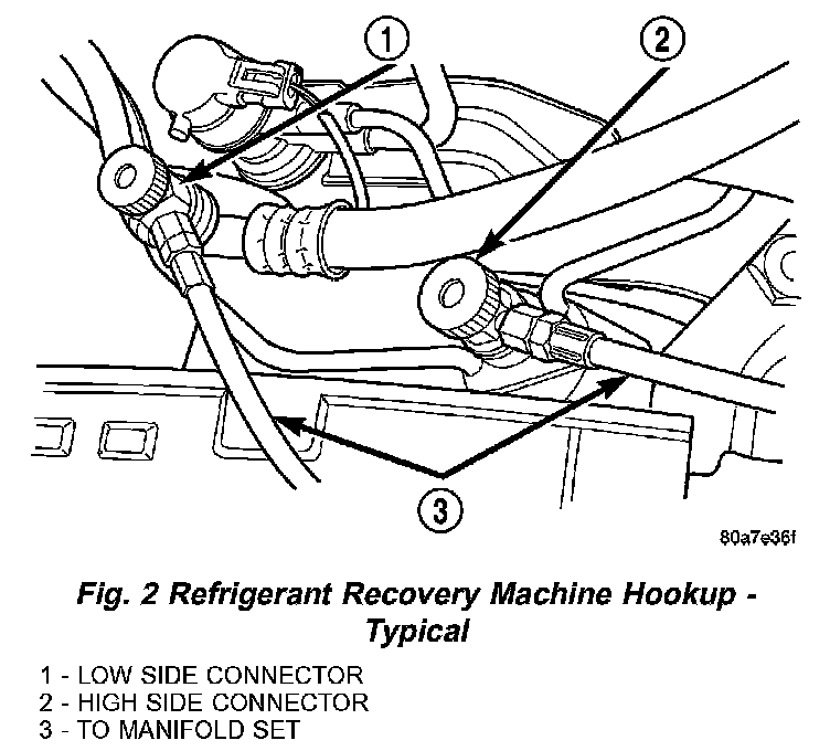 1. Connect a suitable charging station, refrigerant recovery machine or a manifold gauge set with vacuum pump and refrigerant recovery equipment.