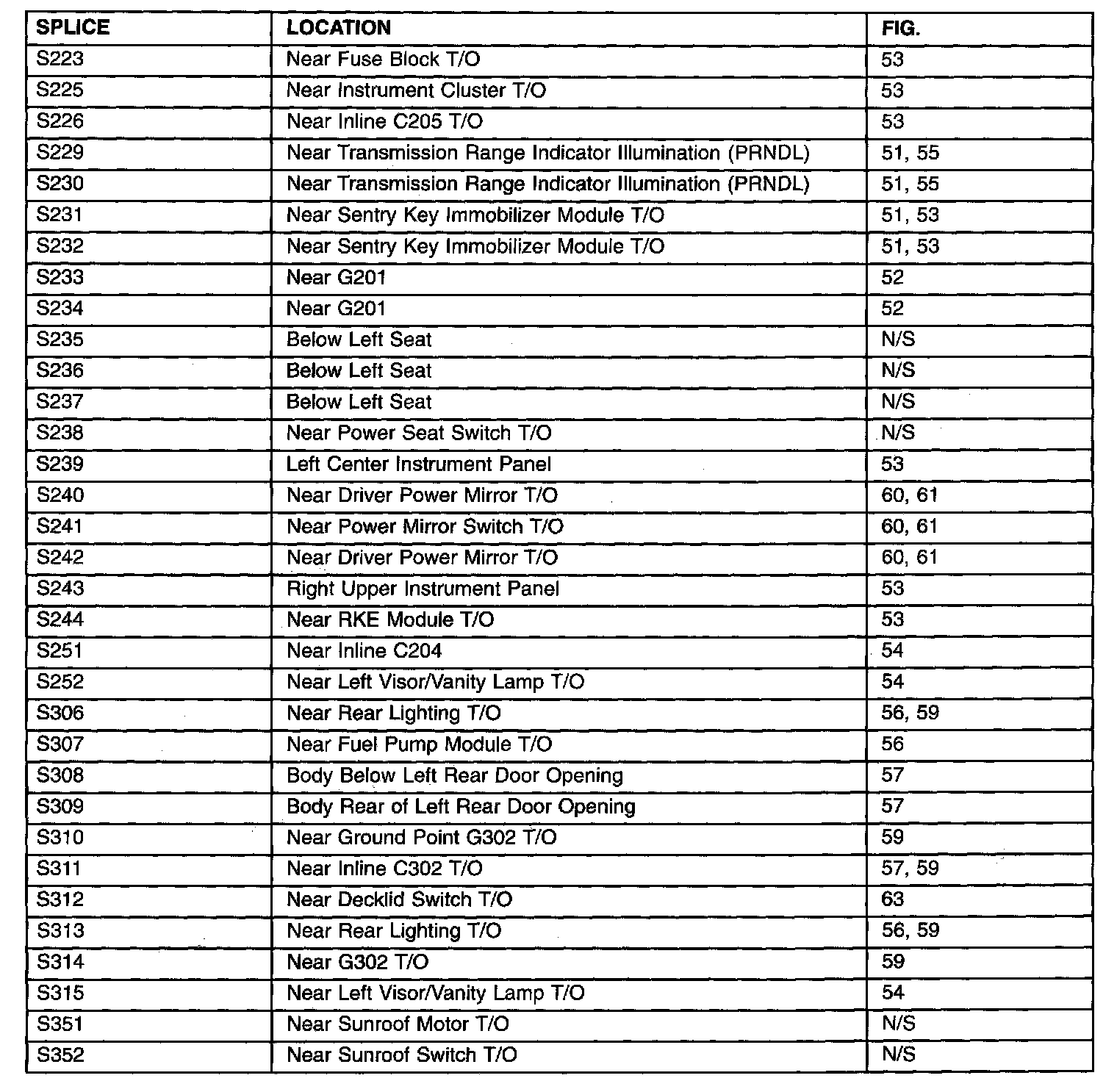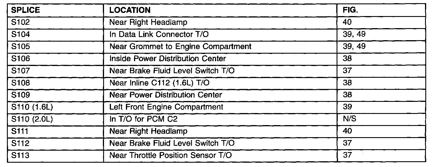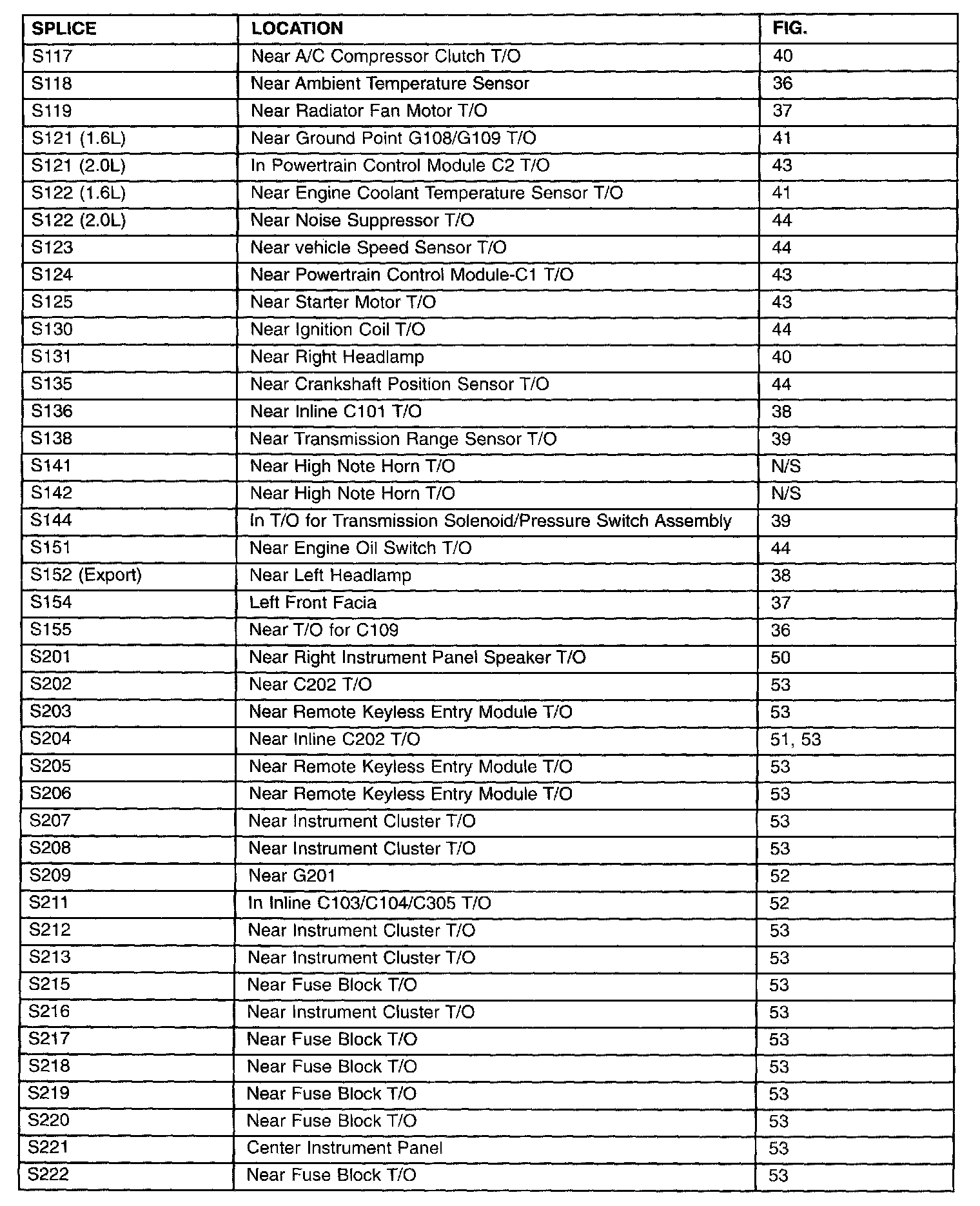 The abbreviation T/O (Take Out) is used in the location column to indicate a point in which the wiring harness branches out to a component.