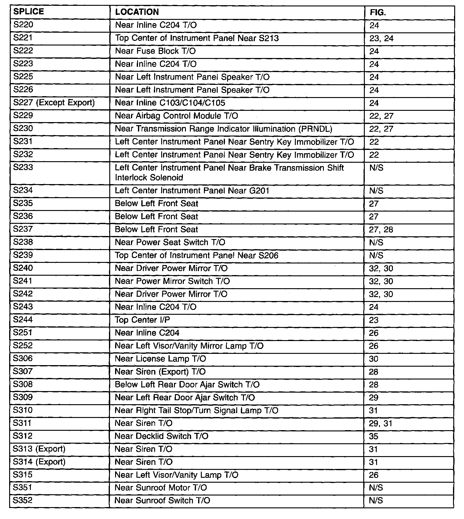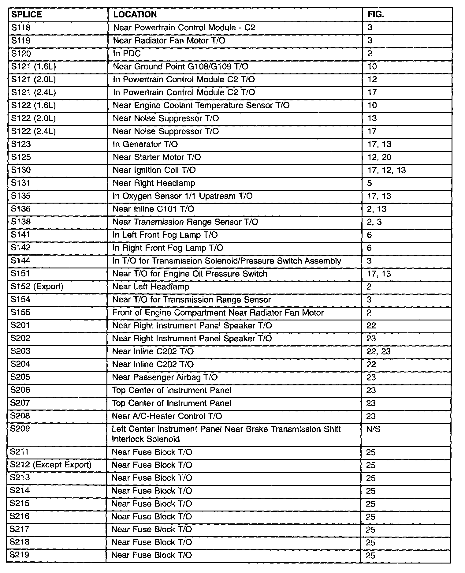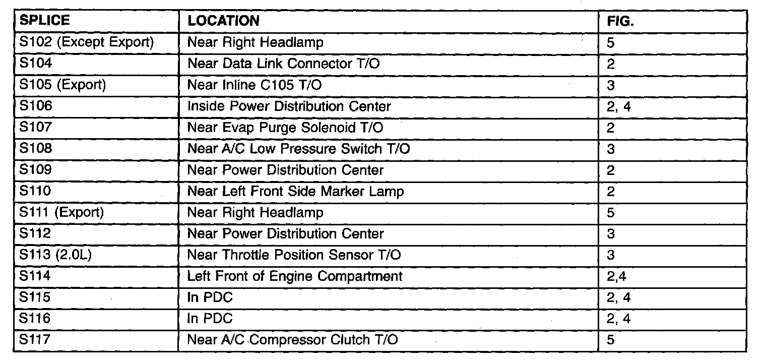 The abbreviation T/O (Take Out) is used in the location column to indicate a point in which the wiring harness branches out to a component.