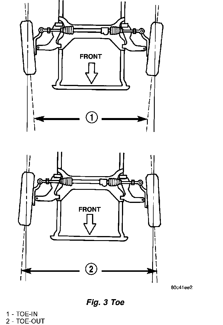 Dynamic toe pattern is the inward and outward toe movement of the front and rear tires through the suspension's jounce and rebound travel. As the vehicle's suspension moves up and down, the toe pattern varies. Toe pattern is critical in controlling the directional stability of the vehicle while in motion. Front and rear dynamic toe pattern is preset by the factory at the time the vehicle is assembled.