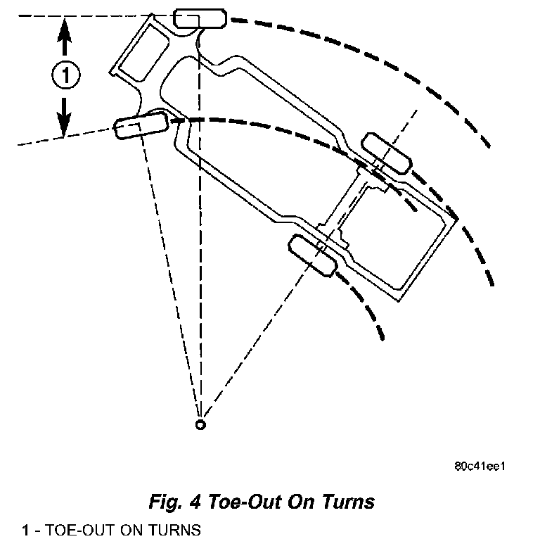 Toe-out on turns is the relative positioning of the front wheels while steering through a turn. This compensates for each front wheel's turning radius. As the vehicle encounters a turn, the outboard wheel must travel in a larger radius circle than the inboard wheel. The steering system is designed to make each wheel follow its particular radius circle. To accomplish this, the front wheels must progressively toe outward as the steering is turned from center. This eliminates tire scrubbing and undue tire wear when steering a vehicle through a turn.