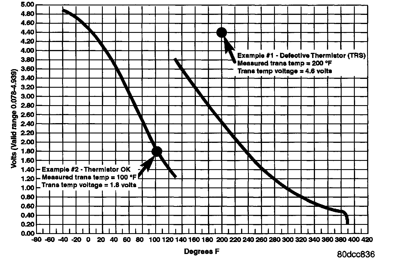 TRANSMISSION TEMPERATURE SENSOR (DUAL RANGE) START ENGINE. WITH DRB, MONITOR AND RECORD TRANSMISSION TEMPERATURE VOLTAGE. COMPARE THE MEASURED TEMPERATURE AND VOLTAGE WITH THE GRAPH SHOWN. THE MEASURED VALUE SHOULD FALL ON ONE OF THE LINES ON THE GRAPH.