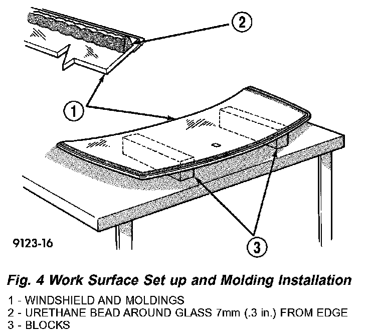4. Position the windshield inside up on a suitable work surface with two padded, wood 10 cm by 10 cm by 50 cm (4 in. by 4 in. by 20 in.) blocks, placed parallel 75 cm (2.5 ft.) apart (Fig. 4).