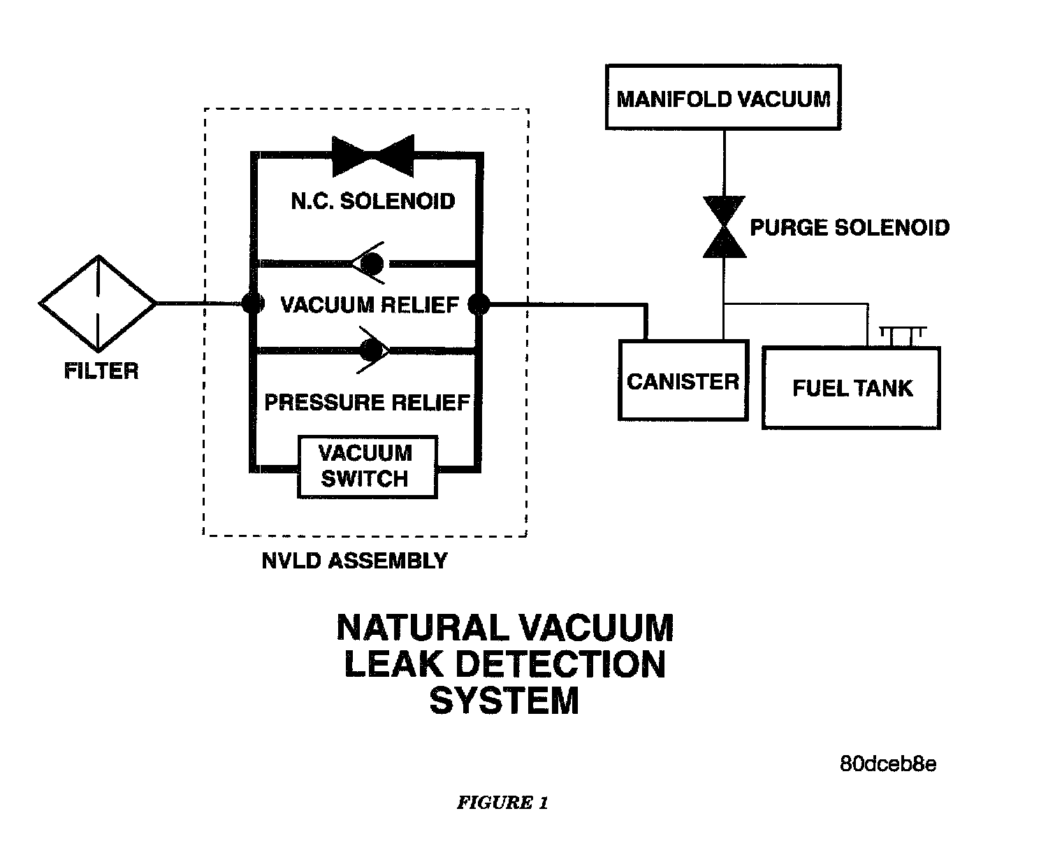 A vent valve seals the canister vent during engine off conditions. If the vapor system has a leak of less than the failure threshold, the evaporative system will be pulled into a vacuum, either due to the cool down from operating temperature or diurnal ambient temperature cycling The diurnal effect is considered one of the primary contributors to the leak determination by this diagnostic. When the vacuum in the system exceeds about 1" H20 (0.25 kPa), a vacuum switch closes. The switch closure sends a signal to the PCM. The PCM, via appropriate logic strategies (described below), utilizes the switch signal, or lack thereof, to make a determination of whether a leak is present.