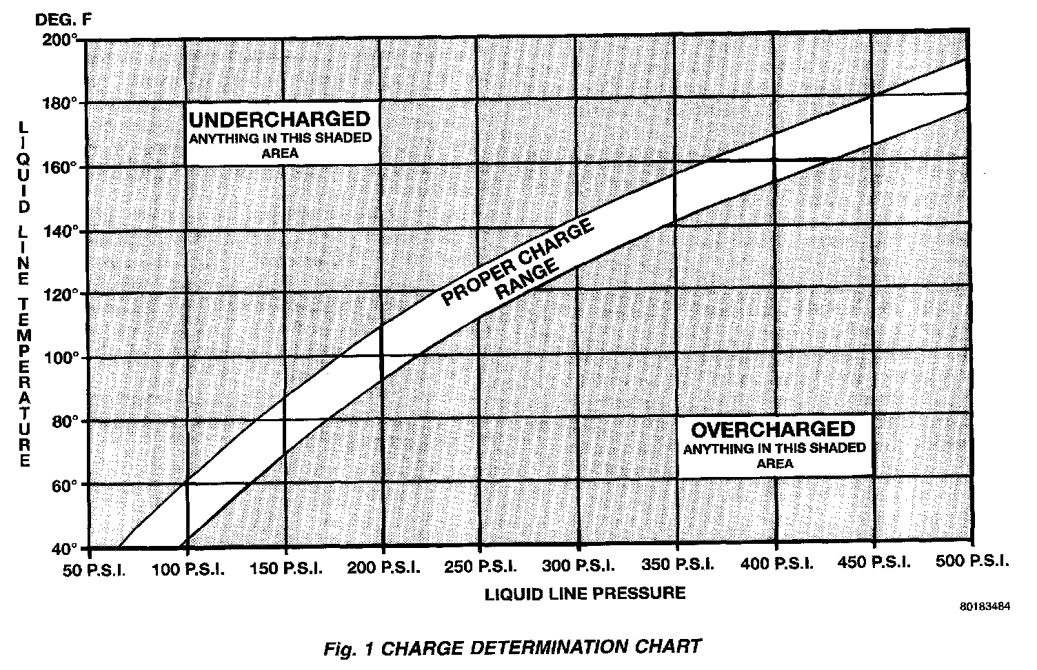 5. Observe filter/drier pressure and Liquid line temperature. Using the Charge Determination Chart determine where the system is currently operating. If the system is not in the proper range, reclaim all the refrigerant and recharge per A/C label.