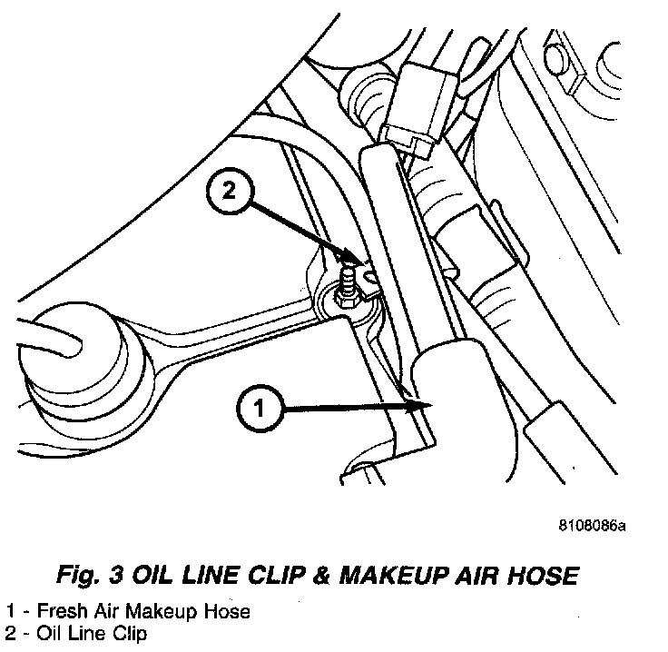 3. Remove the nut holding the clip for the oil supply line to the turbo and disconnect the fresh air makeup hose from the valve cover.