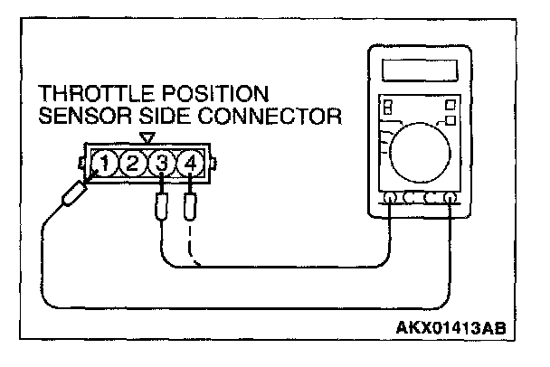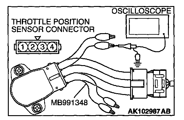 1. Disconnect the throttle position sensor connector and connect the test harness special too (MB991348) in between. (All terminals should be connected.)
