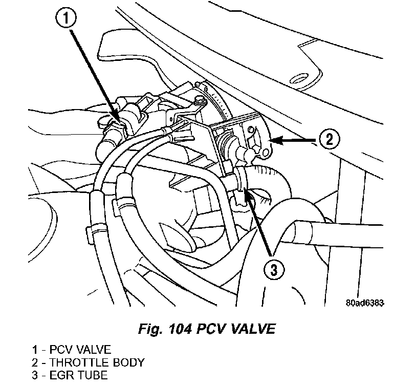 6. Disconnect Vapor Purge hose, Brake Booster hose, Speed Control Servo, Positive Crankcase Ventilation (PCV) hose (Fig. 104).