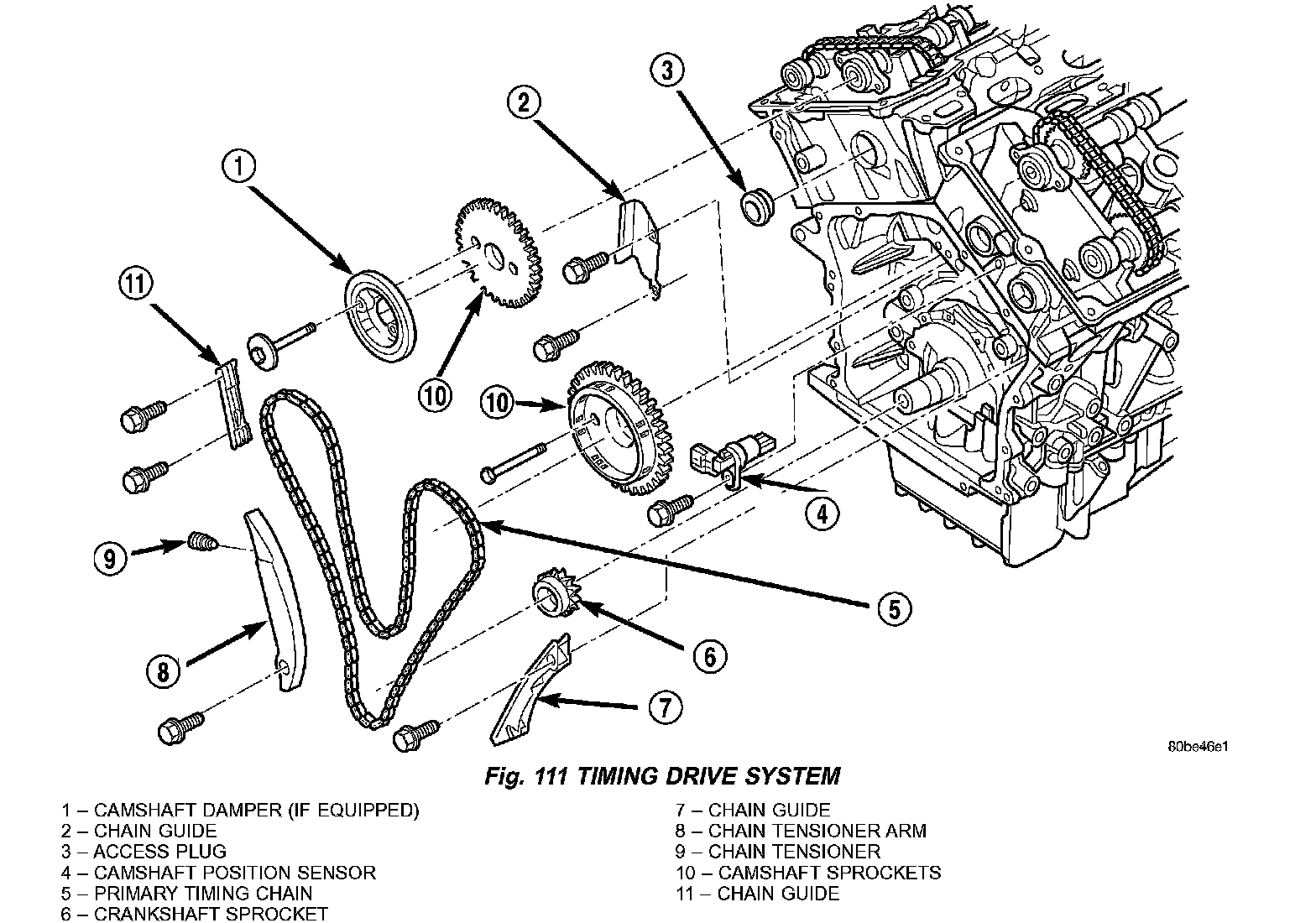 The primary timing chain drive (Fig. 111) uses a single, double-flexure, inverted tooth type chain. The primary chain drives both of the intake camshafts directly from a sprocket mounted on the crankshaft. In addition, the water pump is driven by the "back side" of the primary chain, necessitating the double flexure type chain.