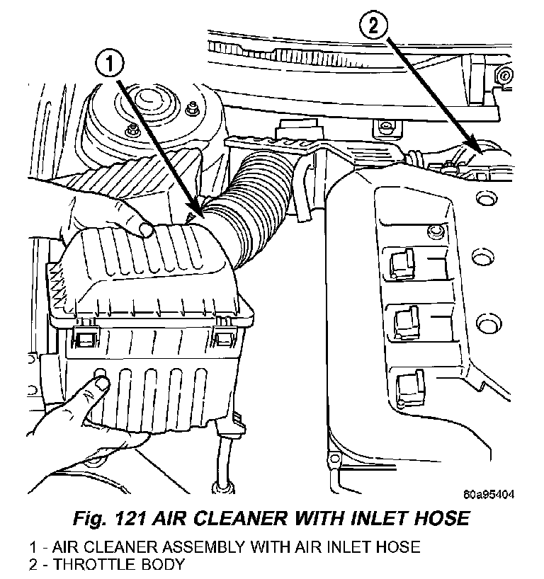 11. Install air cleaner housing and inlet hose (Fig. 121). Connect Inlet Air Temperature (IAT) Sensor connector.