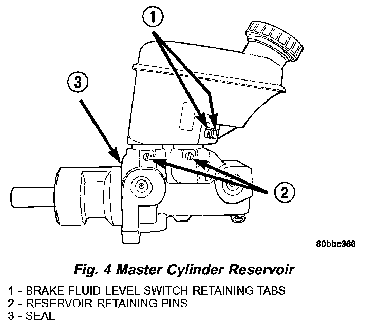 1. Align the brake fluid level switch with its mounting hole on the left side of the master cylinder brake fluid reservoir. Push the switch into the fluid reservoir until the switch retaining tabs are expanded on the other side of the reservoir, locking it in place (Fig. 4).