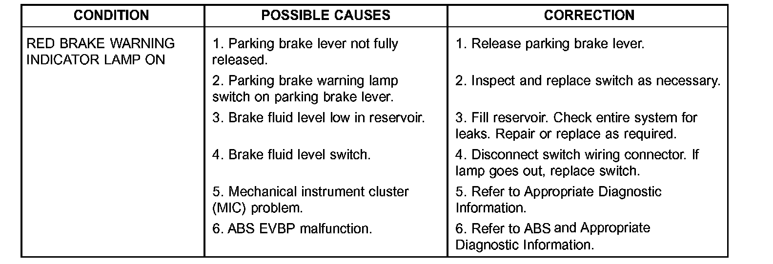 DIAGNOSIS AND TESTING - BASE BRAKE SYSTEM DIAGNOSIS CHARTSNOTE: There are three diagnosis charts shown that cover the RED BRAKE WARNING INDICATOR LAMP, BRAKE NOISE and OTHER BRAKE CONDITIONS.