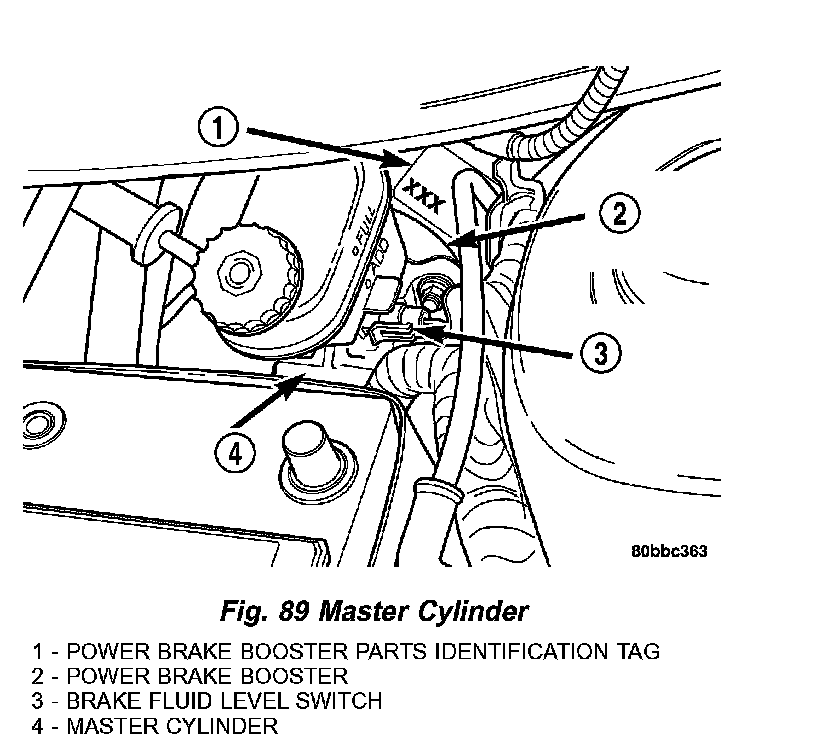 Master cylinder reservoirs are marked, FULL and MIN, indicating the allowable brake fluid level range in the master cylinder brake fluid reservoir (Fig. 89).