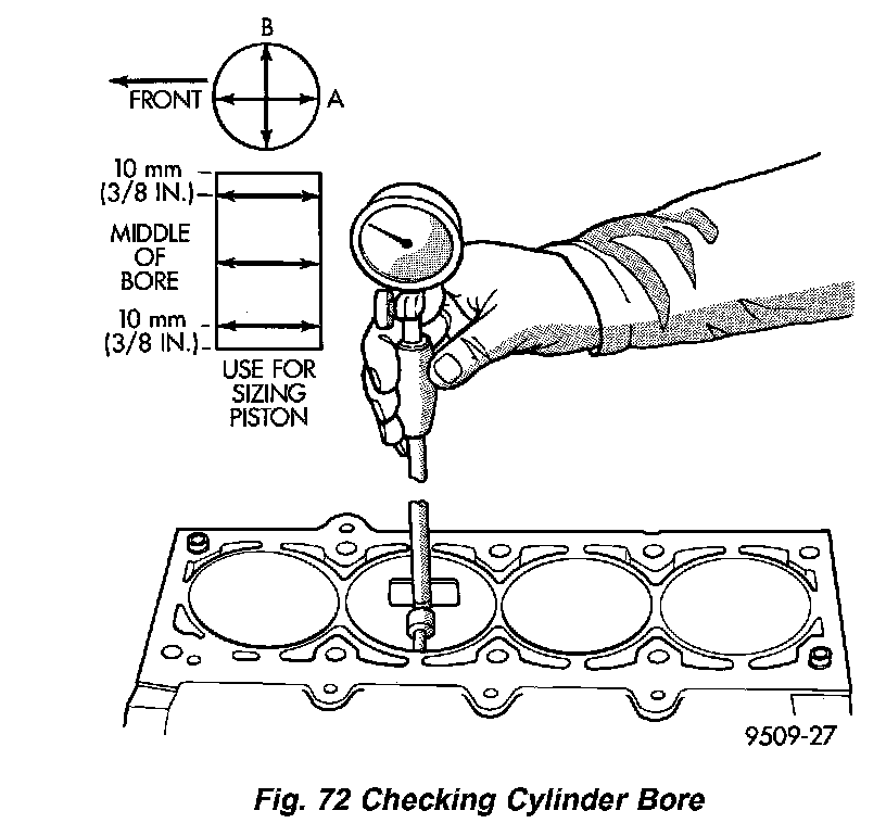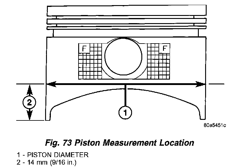 STANDARD PROCEDURE - CYLINDER BORE AND PISTON - FITTINGPiston and cylinder wall must be clean and dry. Piston diameter should be measured 90 degrees to piston pin about 14 mm (9/16 inch.) from the bottom of the skirt as shown in (Fig. 73). Cylinder bores should be measured halfway down the cylinder bore and transverse (measurement location B) to the engine crankshaft center line shown in (Fig. 72). (Refer to - ENGINE - SPECIFICATIONS) Correct piston to bore clearance must be established in order to assure quiet and economical operation.