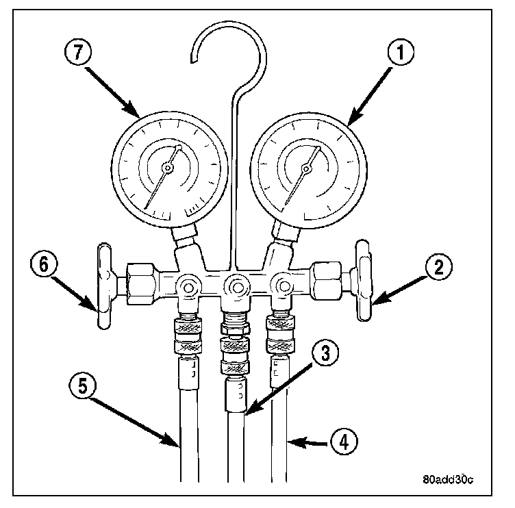 A manifold gauge set (1) may be needed with some recovery/recycling/charging equipment. The manifold gauge set should have manual shut-off valves (2 and 6), or automatic back-flow valves located at the service port connector end of the manifold gauge set hoses (4 and 5). This will prevent refrigerant from being released into the atmosphere.