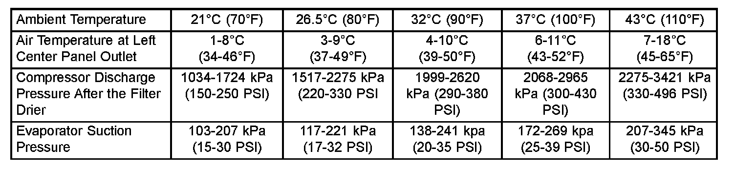 6. With the A/C clutch engaged, compare the discharge air temperature to the A/C Performance Temperatures charts.