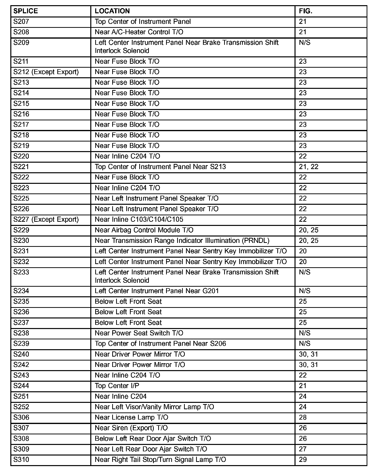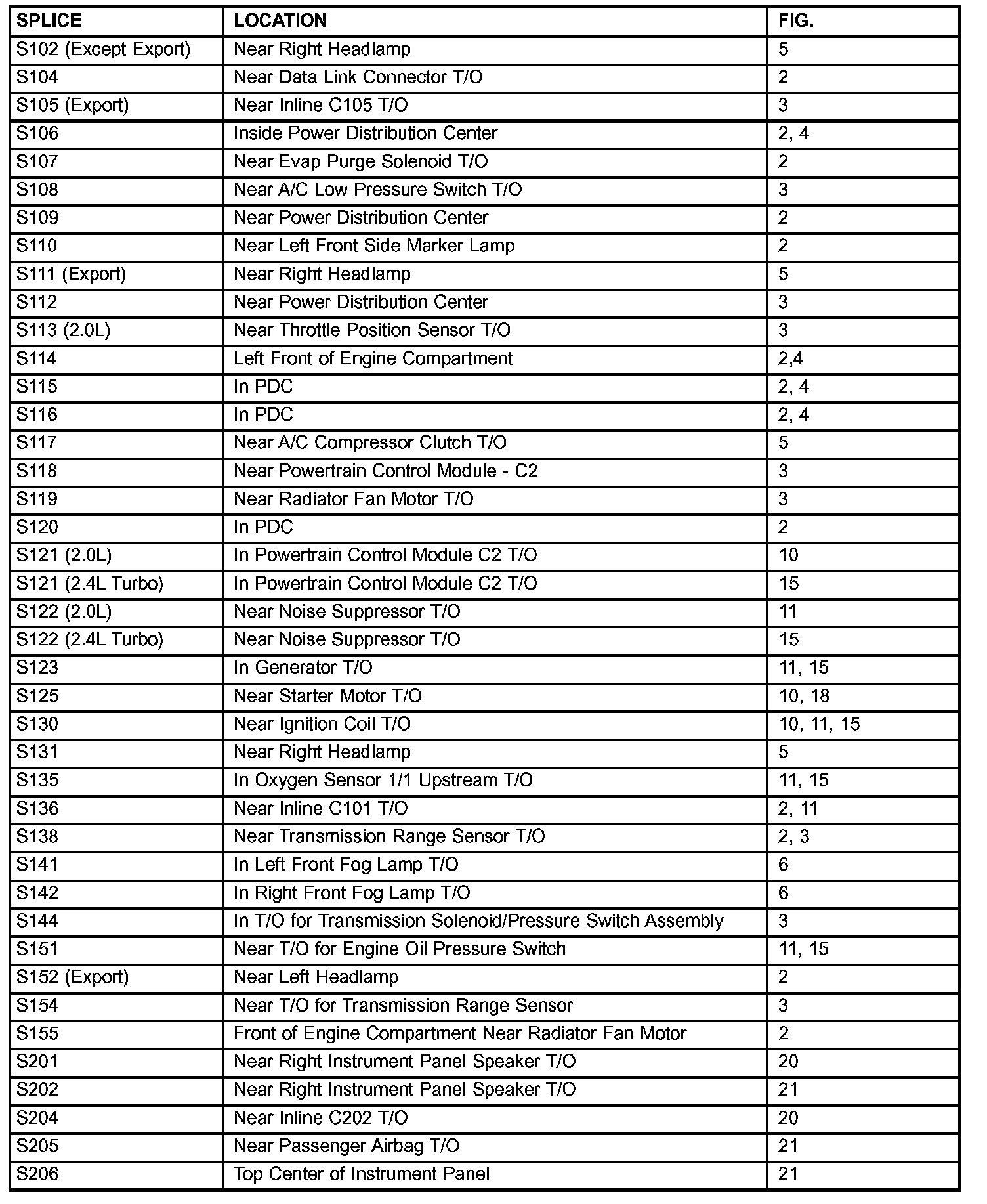 The abbreviation T/O (Take Out) is used in the location column to indicate a point in which the wiring harness branches out to a component.