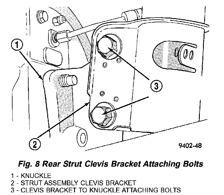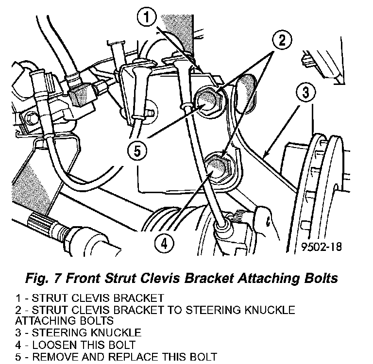 3. Remove the original upper bolt attaching the strut clevis bracket to the knuckle (Fig. 7) (Fig. 8).