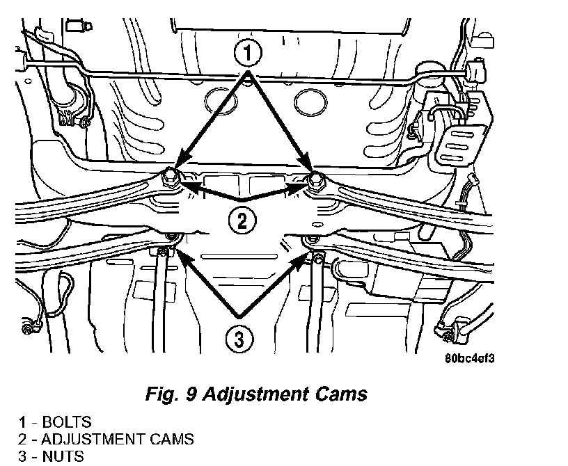 2. Rotate each toe adjustment cam until the preferred rear toe specification is obtained (Fig. 9). Refer to WHEEL ALIGNMENT SPECIFICATIONS.