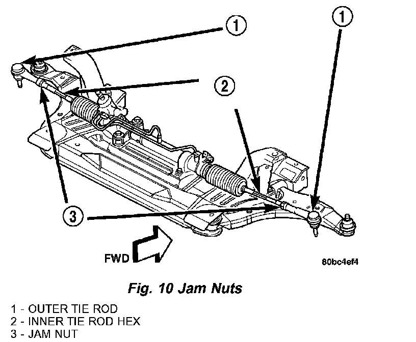 1. Loosen the tie rod adjusting jam nuts (Fig. 10). Grasp each inner tie rod at its hex and rotate it one way or the other until the front wheel toe is set to the preferred specification. Refer to WHEEL ALIGNMENT SPECIFICATIONS.