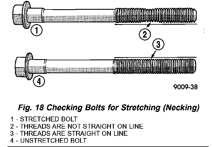 Necking can be checked by holding a scale or straight edge against the threads. If all the threads do not contact the scale, the bolt(s) should be replaced.