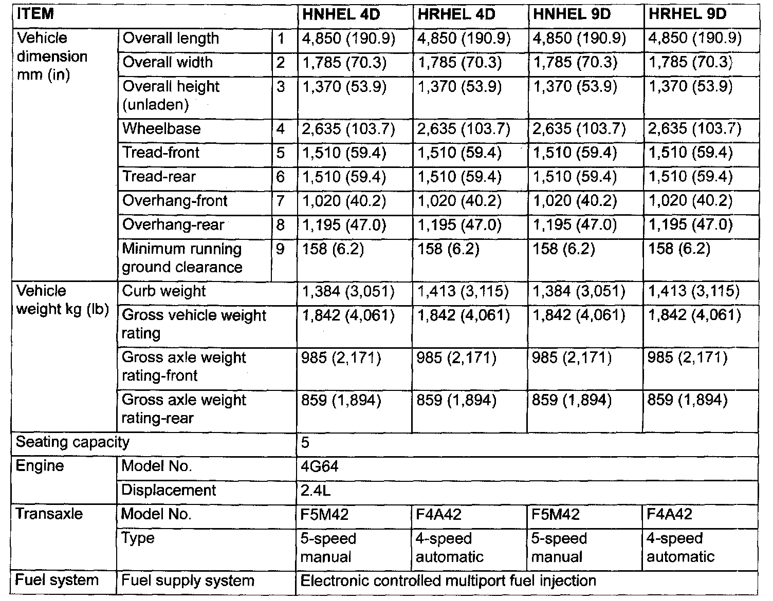 GENERAL SPECIFICATIONS(Model With 2.4L Engine):