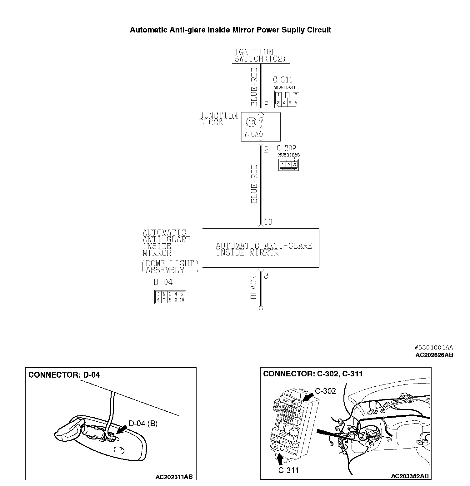 If the angle of the automatic anti-glare inside mirror does not change, the mirror power supply circuit or the mirror itself may be defective.