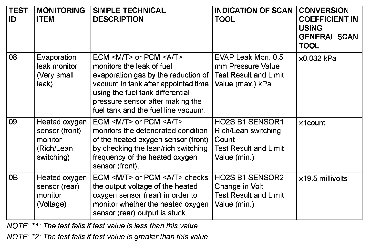 By selecting MODE 6 using scan tool, Test Result and Limit Value (minimum) *1 or (maximum) *2 about the main items of emission control system which ECM or PCM