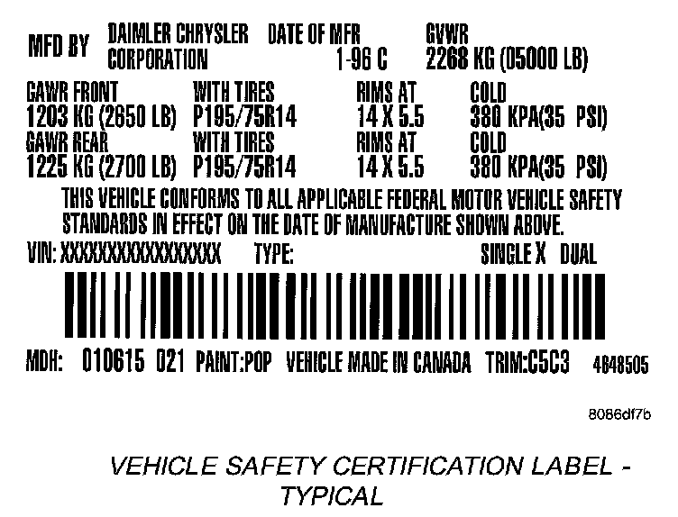 A vehicle safety certification label is attached to the rear surface of the driver's door. This label indicates date of manufacture (month and year), Gross Vehicle Weight Rating (GVWR), Gross Axle Weight Rating (GAWR) front, Gross Axle Weight Rating (GAWR) rear and the Vehicle Identification Number (VIN). The Month, Day and Hour of manufacture is also included.